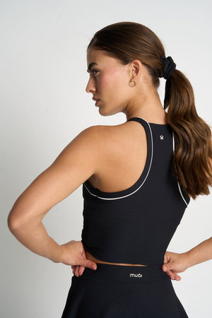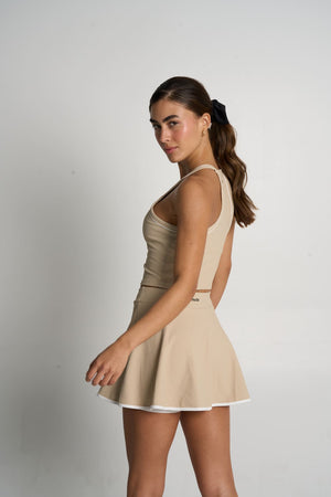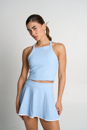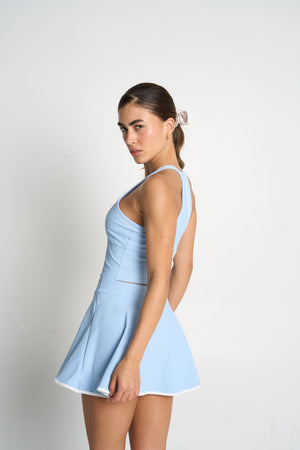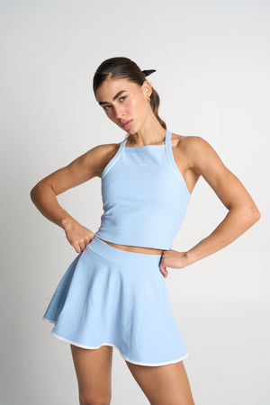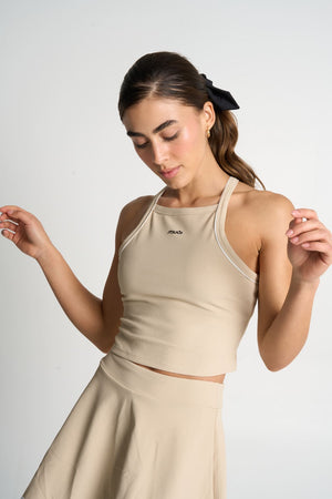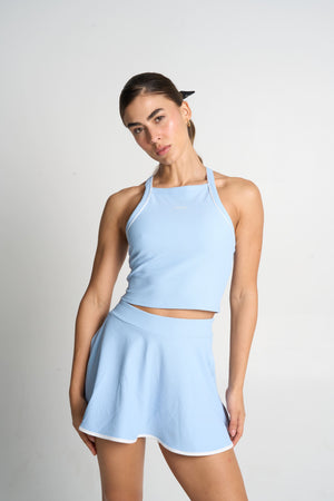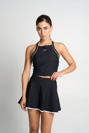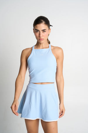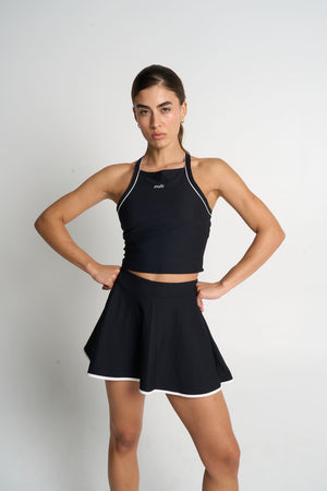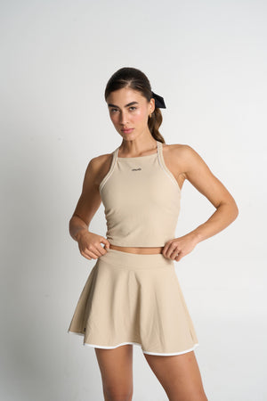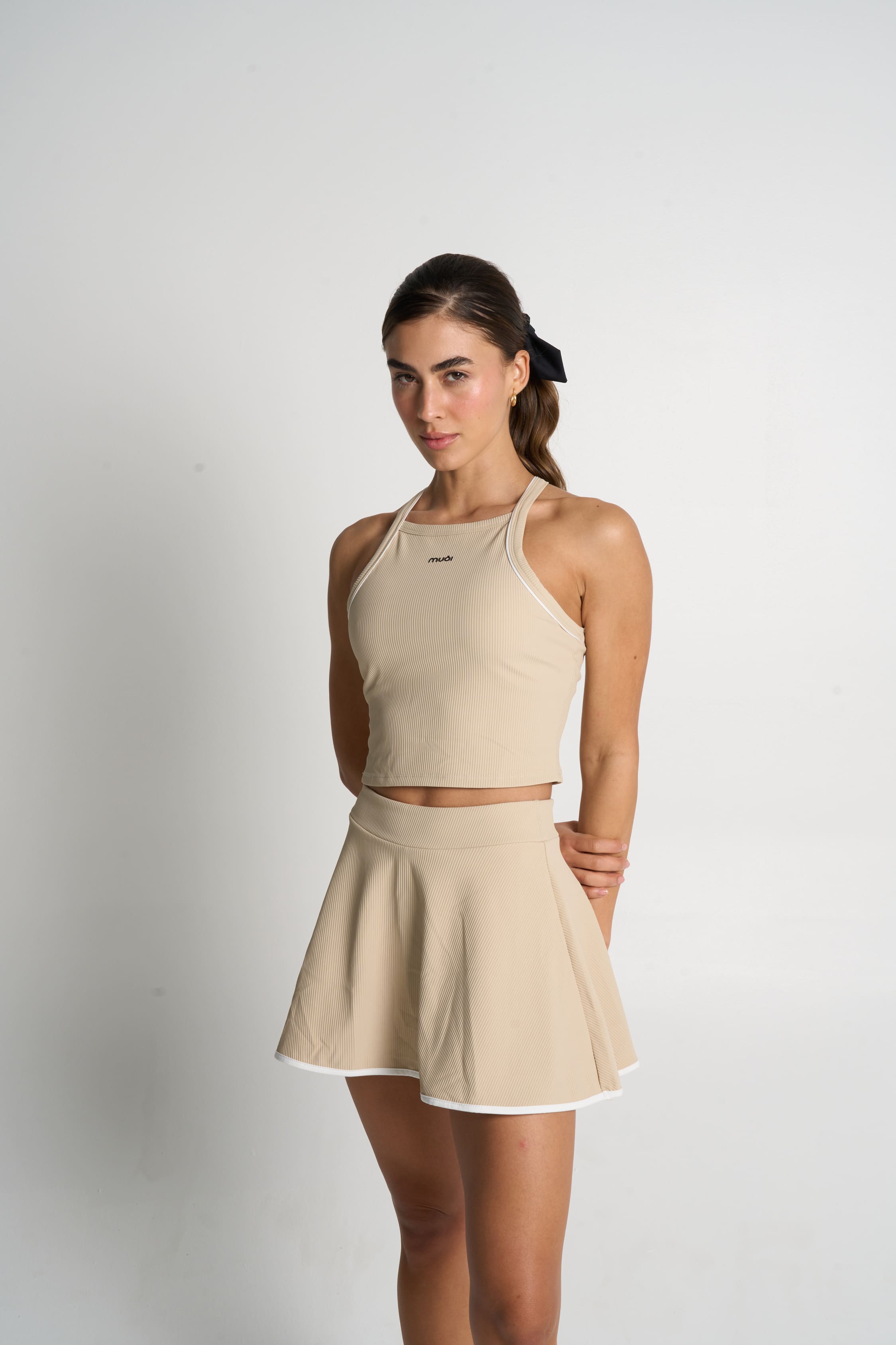 El top ofrece un ajuste delicado que abraza el torso con sensación de segunda piel, mientras que la falda de caída fluida aporta libertad, movimiento y un acabado sofisticado. Un set versátil que transita con naturalidad entre el entrenamiento, el descanso y el día a día.